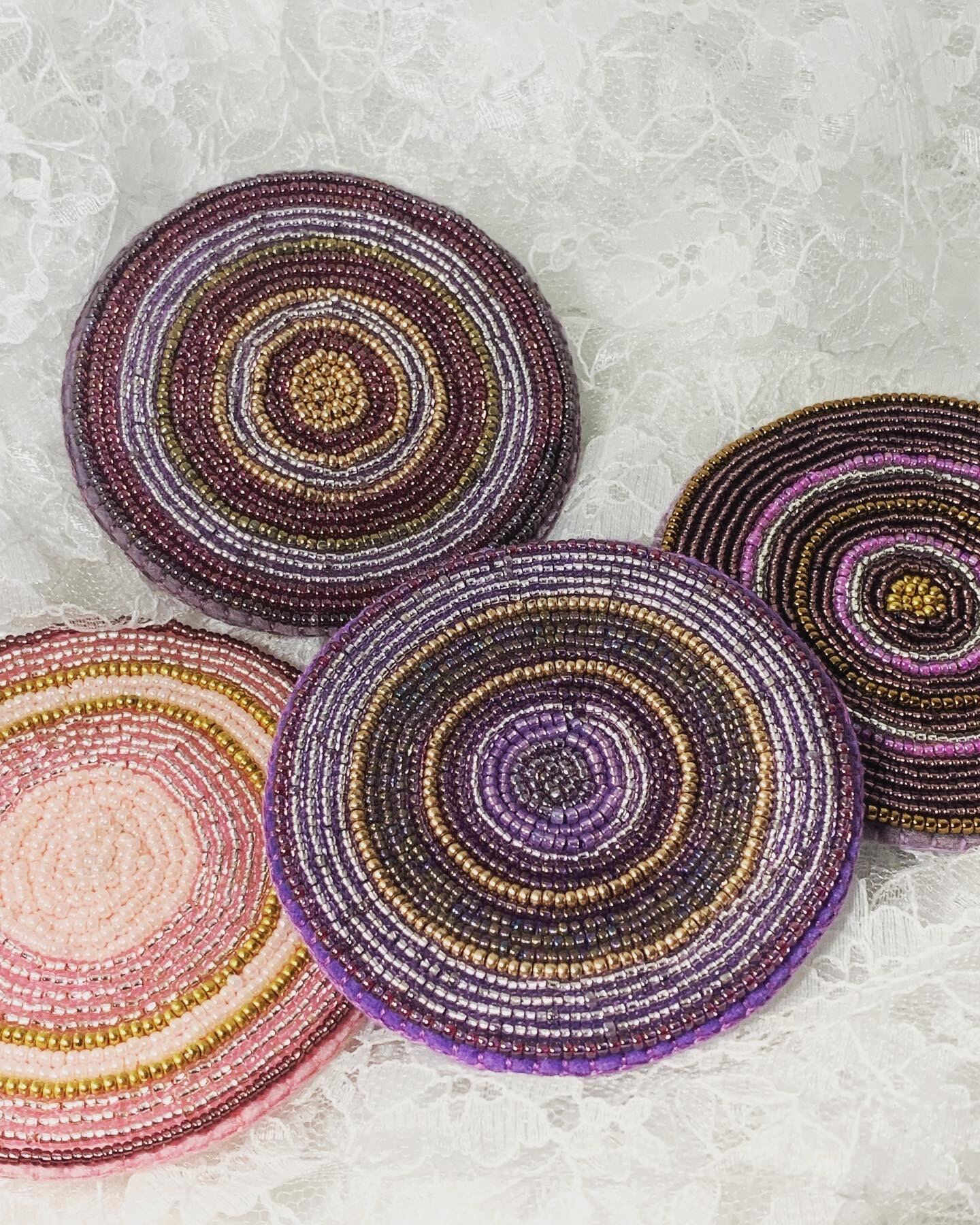 ビーズを一針ずつフェルトにつけたコースターになります。